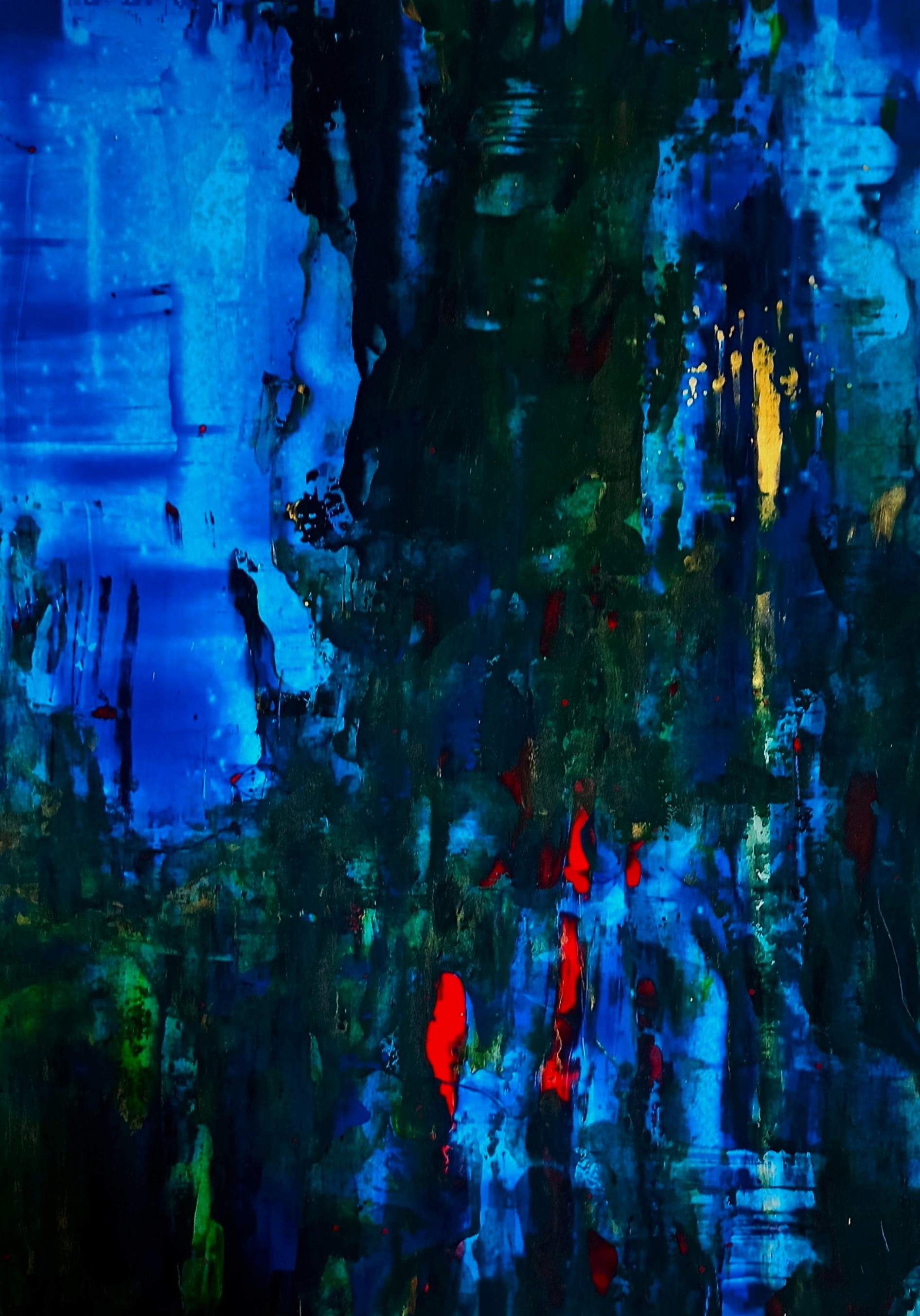 DEEP IX from the DEEP series continues the visual exploration of depth present throughout the series, revealing a space where the intensity of color becomes a carrier of emotion and inner tension. Fields of blue and green create a delicate, multi-layered structure reminiscent of a fragmented landscape of memory or experience.