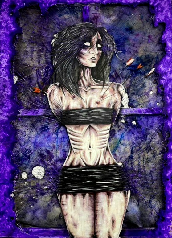 Cette œuvre est une représentation personnelle d'un ressenti tristement universel.Les fils innombrables pour interpréter l'oppression insidieuse. Le violet teinte féminine pour les ecchymoses honteuses. La toile de fond à l'aspect usé et négligé témoigne de toutes ses méprises visibles et invisibles. Même son regard lui a été enlevé elle ne sait plus où le poser.