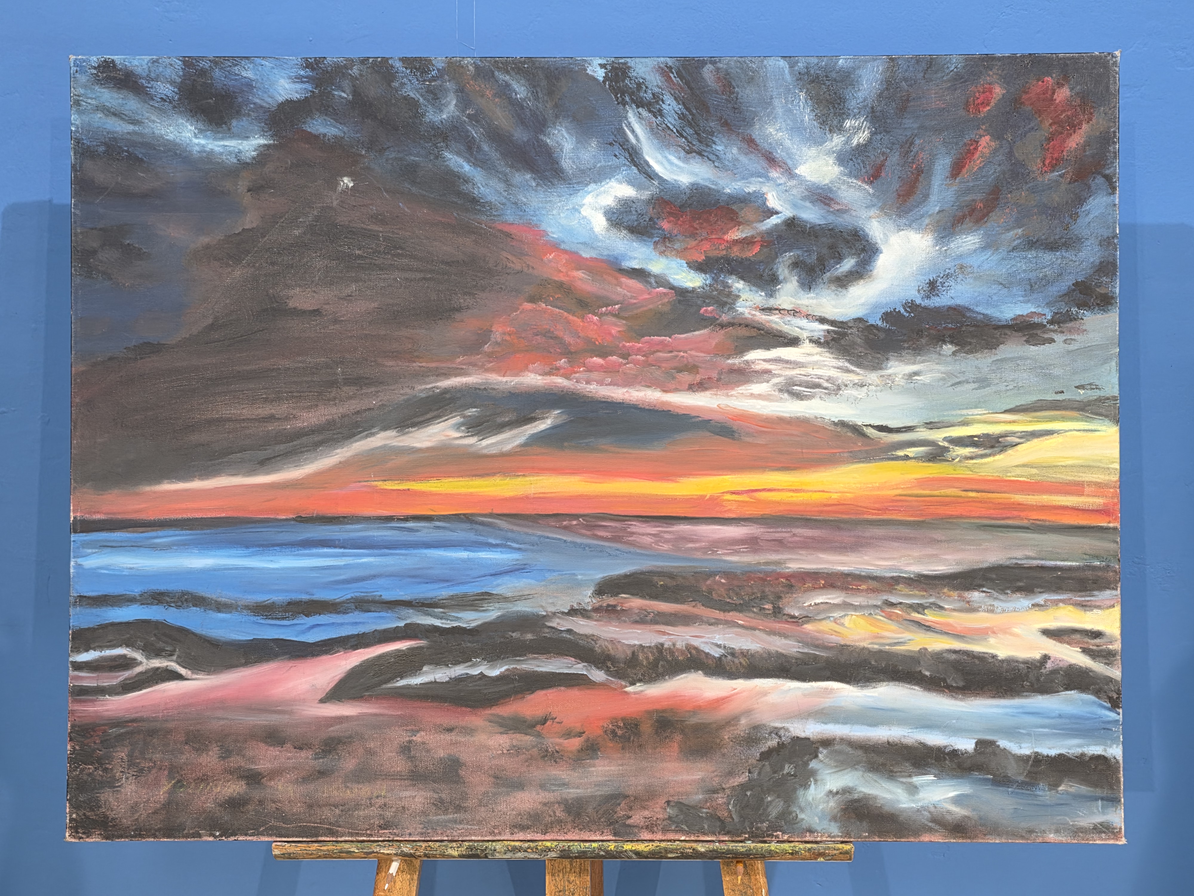 This work presents a charged seascape suspended in a tense stillness before the storm. A luminous horizon cuts through the dark mass of gathering clouds, while vivid passages of crimson, blue, and gold heighten the sense of expectancy and pressure. The composition does not necessarily try to focus on only the storm itself, but on the emotional and visual intensity of what precedes it. Broad, expressive forms within the sky suggest instability and motion, while the land and water below remain fluid and unsettled, as if responding to an unseen force. Through this heightened treatment of light and color, the painting explores themes of anticipation, volatility, and fragile calm, which exists just before rupture.