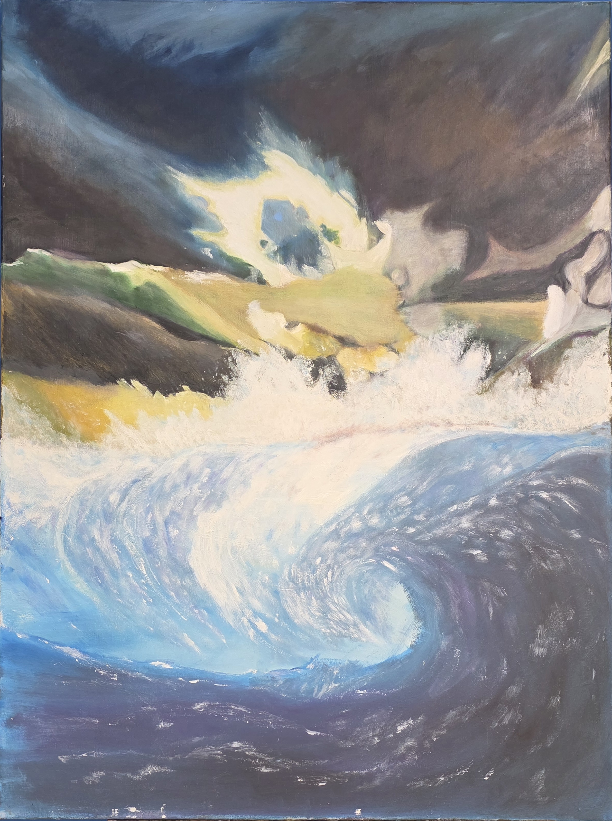 This painting transforms the sea and sky into opposing elemental forces locked in confrontation. A powerful curling wave dominates the foreground, rendered with sweeping movement and tonal variation, while the darkened sky presses downward with dramatic intensity. At the center, a burst of light interrupts the surrounding mass, creating a focal point that suggests both rupture and revelation. The landscape conveys a psychological drama, where water and atmosphere appear charged with emotion. Through bold contrasts, fluid gesture, and expressive form, the painting explores conflict, force, and unstable equilibrium, inviting the viewer to experience turbulence as both a natural event and inner condition.
