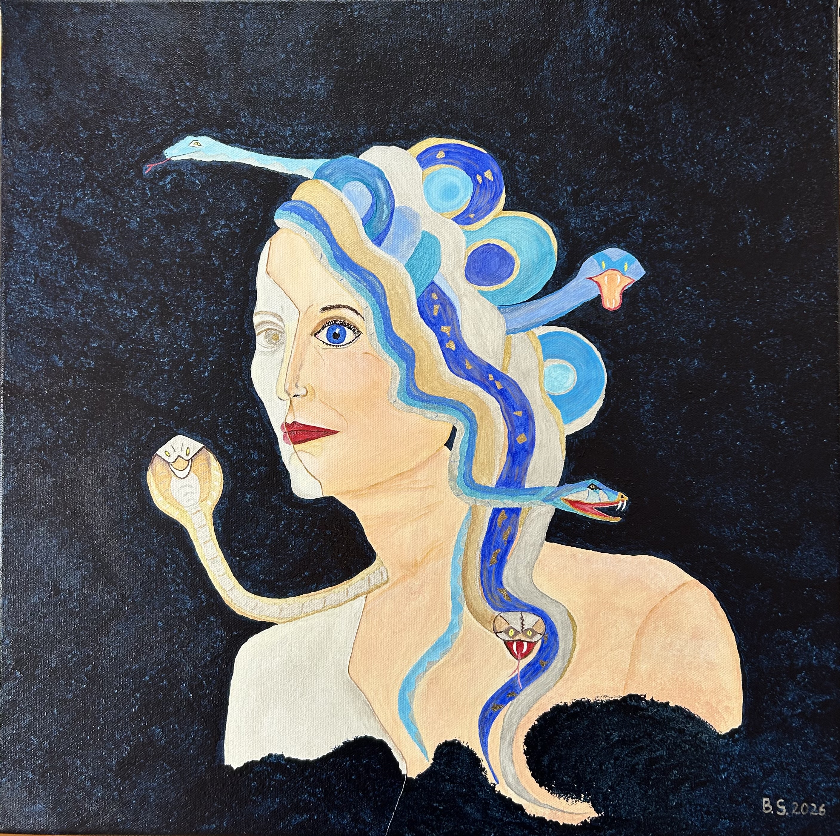 A contemporary reinterpretation of Medusa that shifts the myth of petrification into a reflection on perception and the instability of identity. The face, shown in three quarter view, is split between illusionistic paiting and reflective materials such as silver and gold leaf. While one side suggests psychological depth and presence, the other dissolves into light, reflection, and viewer-dependent perception.
