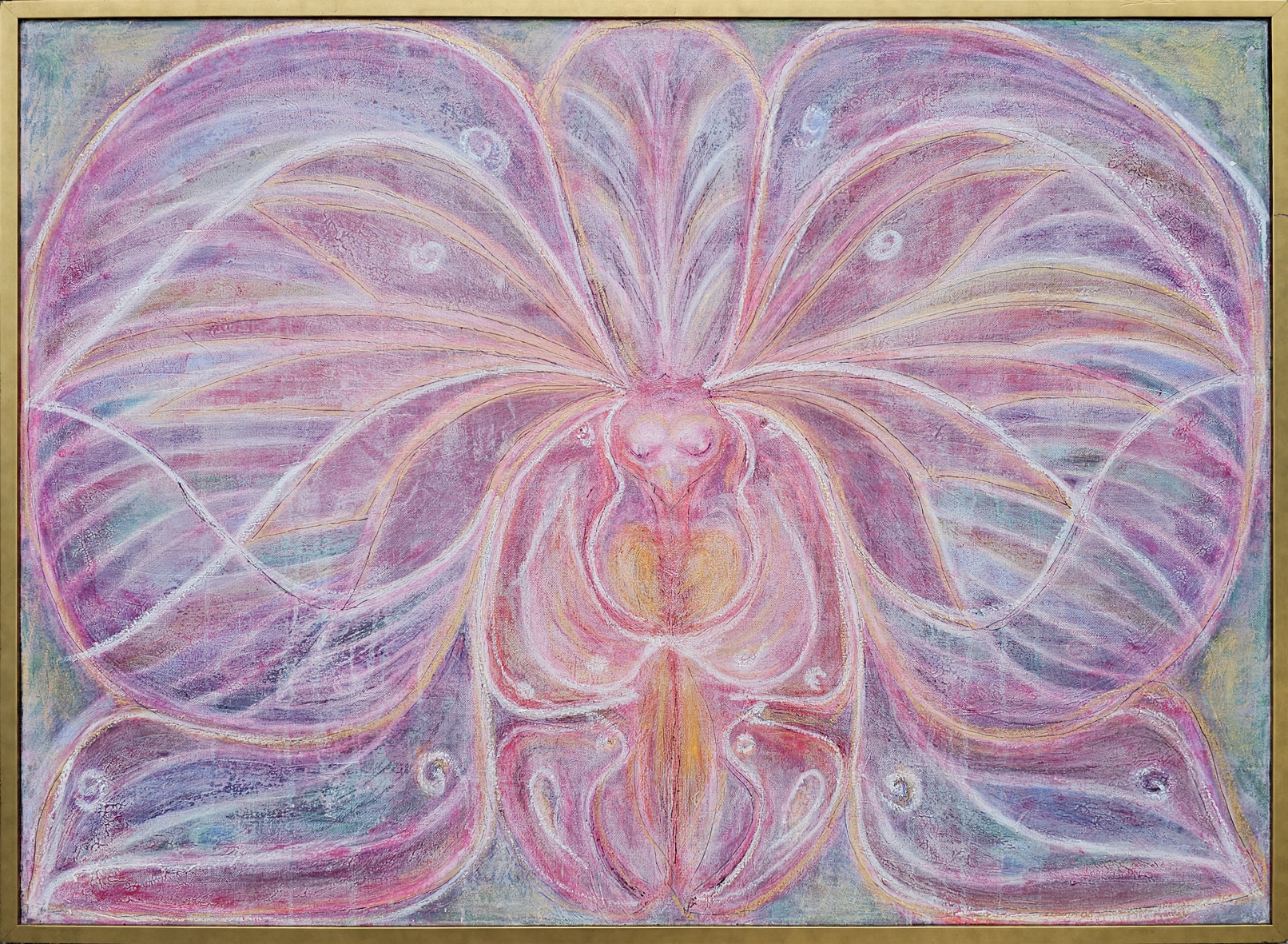 With passion, I have created the interwoven forms of a surreal orchid life in this work, which gains a magical depth through oil, pastel, and gold leaf. Every line and nuance of color conveys life, mystery, and fragility – it is intended to transport the viewer to a dream world that brings tranquility, imagination, and energy into your home. This image can be viewed from multiple angles (rotatable), leading to ever-changing perspectives.