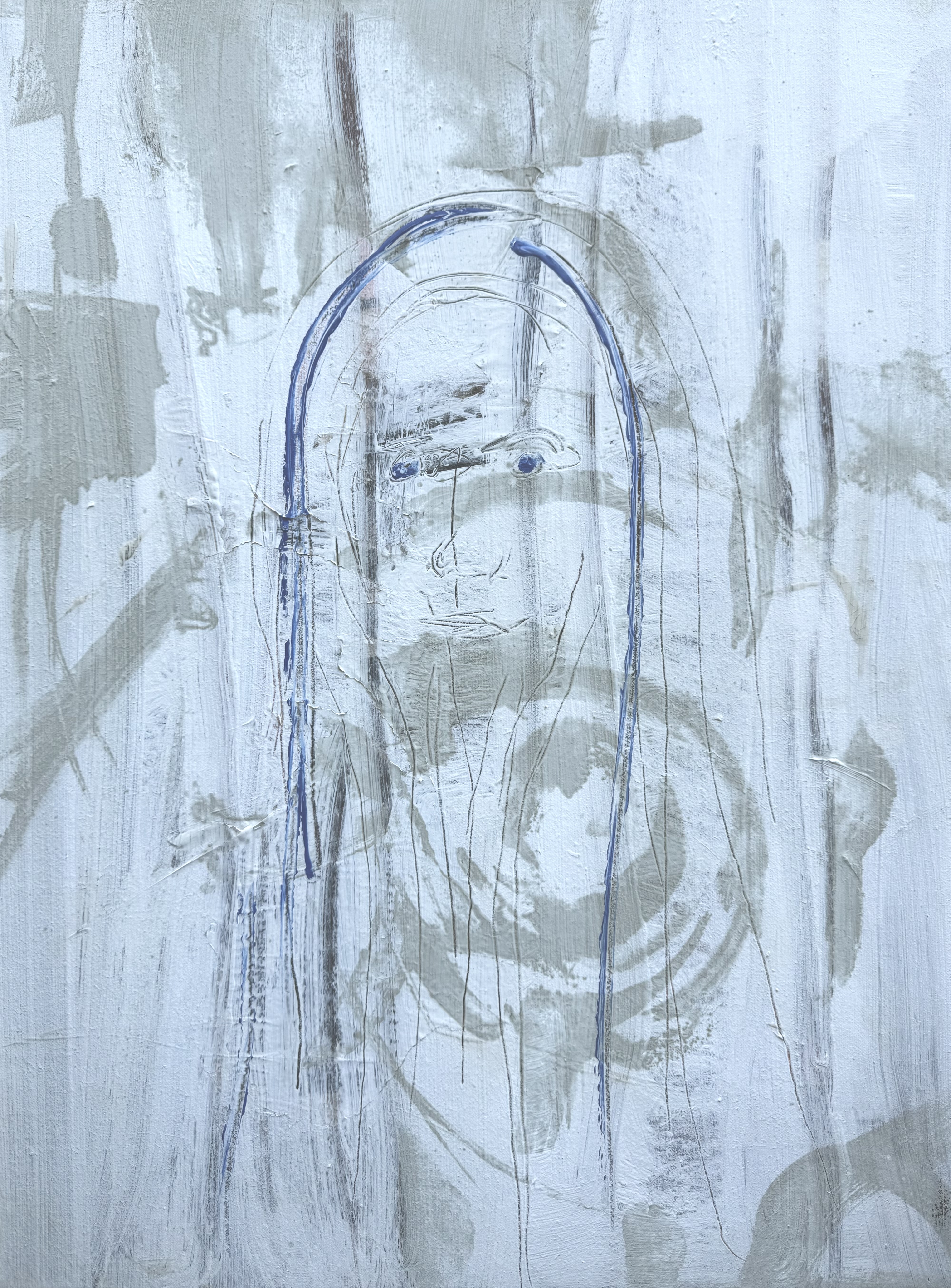 L’opera si presenta come un palinsesto dell’anima, dove la figura umana non viene "ritratta", ma evocata attraverso un processo di sottrazione e stratificazione. In un’epoca dominata dall’iper-definizione digitale, questa pittura sceglie la via del silenzio visivo, lavorando su una palette cromatica ridotta ai minimi termini — bianchi gessosi, grigi cenere e azzurri diafani — che costringe lo spettatore a una visione lenta, quasi meditativa. Il volto emerge dal fondo non come un dato oggettivo, ma come una memoria affiorante. Le linee di contorno, tracciate con una gestualità scarna ed essenziale, sembrano vibrare sotto il peso della materia pittorica sovrastante. È una pittura di "pelle", dove la trama della tela e le pennellate corpose dialogano con segni grafici quasi infantili nella loro purezza, creando un cortocircuito tra la densità dell’olio (o acrilico) e l’astrazione dell’idea. L’uso del blu, che definisce l’arco della testa e lo sguardo, funge da ancora visiva: un guizzo di consapevolezza in un mare di incertezza formale. Questo sguardo — appena accennato, eppure magnetico — interroga chi osserva sulla natura dell’identità: siamo ciò che mostriamo o ciò che resta quando tutto il superfluo viene lavato via? L’opera non cerca il consenso del bello decorativo, ma ambisce alla verità dell’essenza. È un omaggio alla fragilità umana, un’icona contemporanea che celebra l’imperfezione come unico luogo possibile di autenticità.