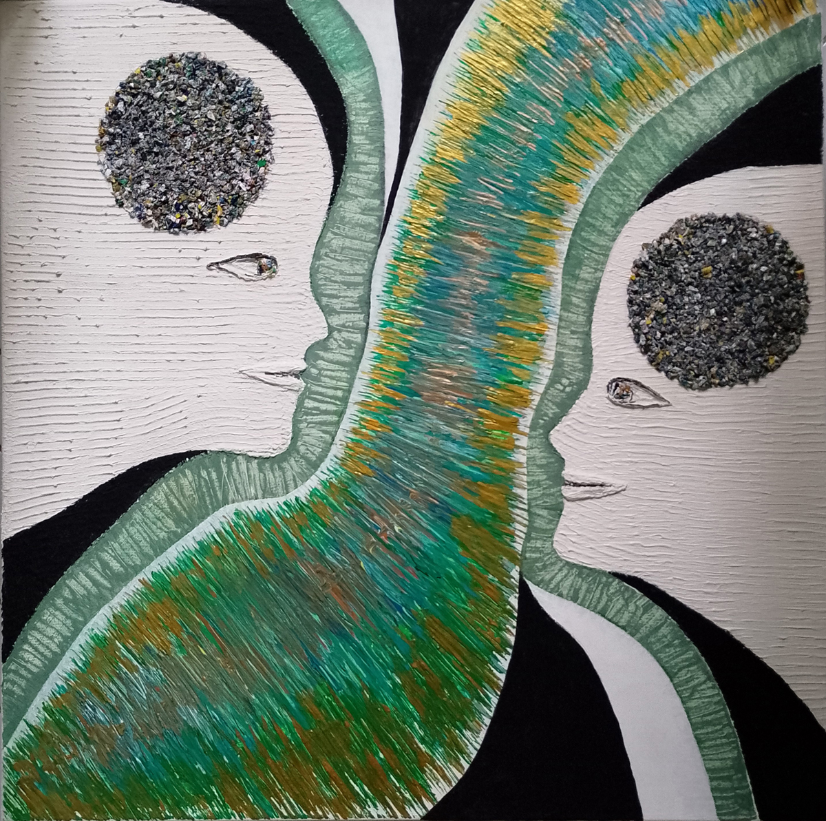 Strukturen auf Leinwand werden mit Acrylfarbe und Acrylstücken und Paste zu einem Bild. Die direkte Komunikation ist nicht immer möglich.
