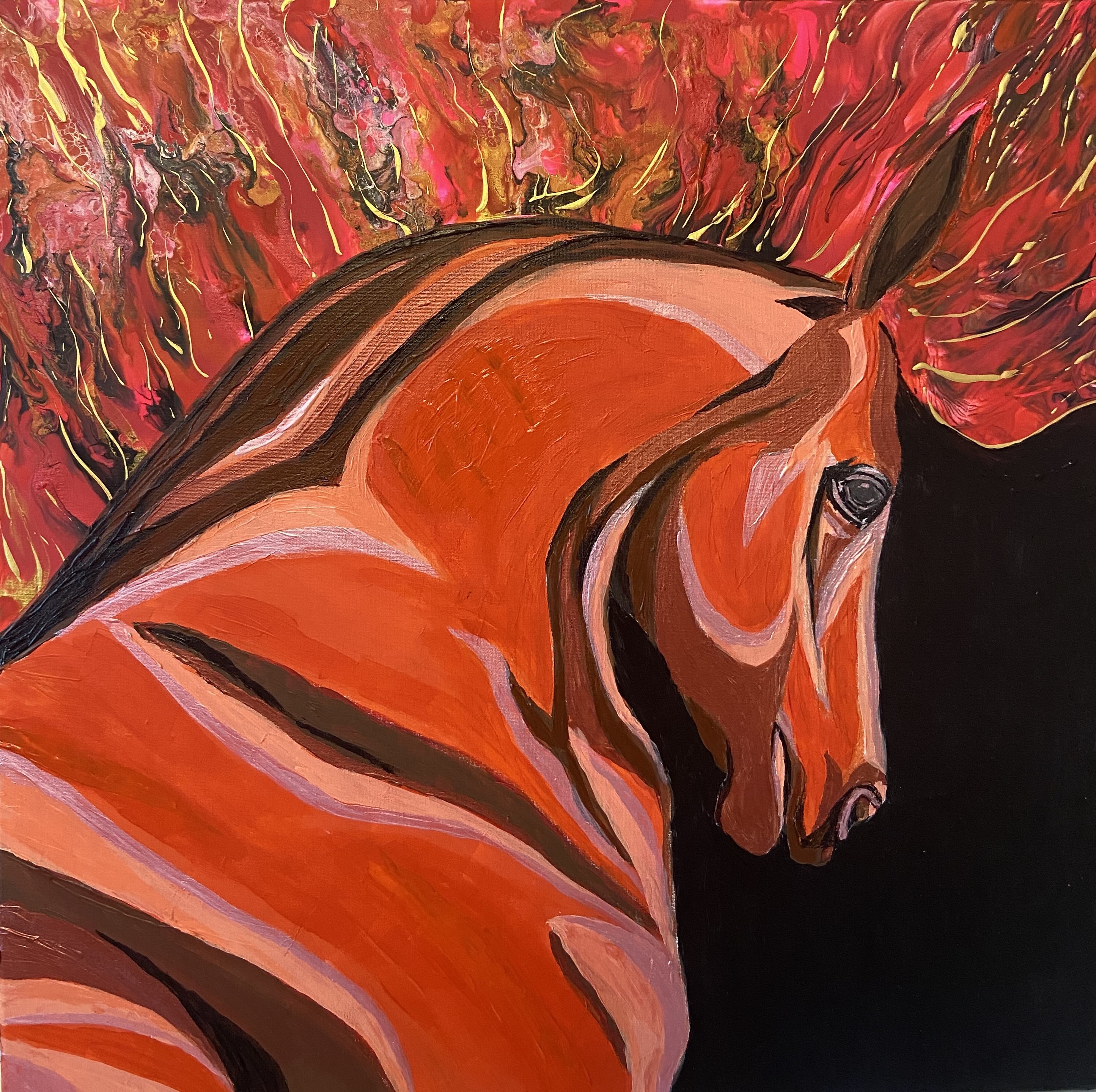 The red horse of war: his mane is an all-consuming flame, in his eyes there is fatigue and sadness - they have seen a lot. He goes into a black abyss. The horse is made in a graphic manner - it is more an idea than an animal.