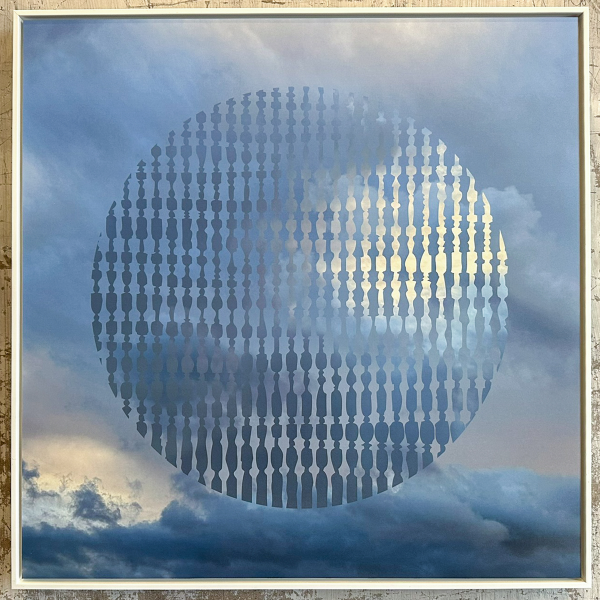 Clouds fill the background, while a central circular area of vertical lines, derived from water waves, reveals another cloud pattern within. Viewers perceive either the background sky, the wave pattern, or the clouds within the lines, but never all at once, creating a multistable effect. Layered forms and shifting cues create images that never fully settle, inviting the viewer to notice their own mind at work as it constructs meaning. Digitally composed from photography, illustration, and 3D models, the image is printed on coated aluminum.