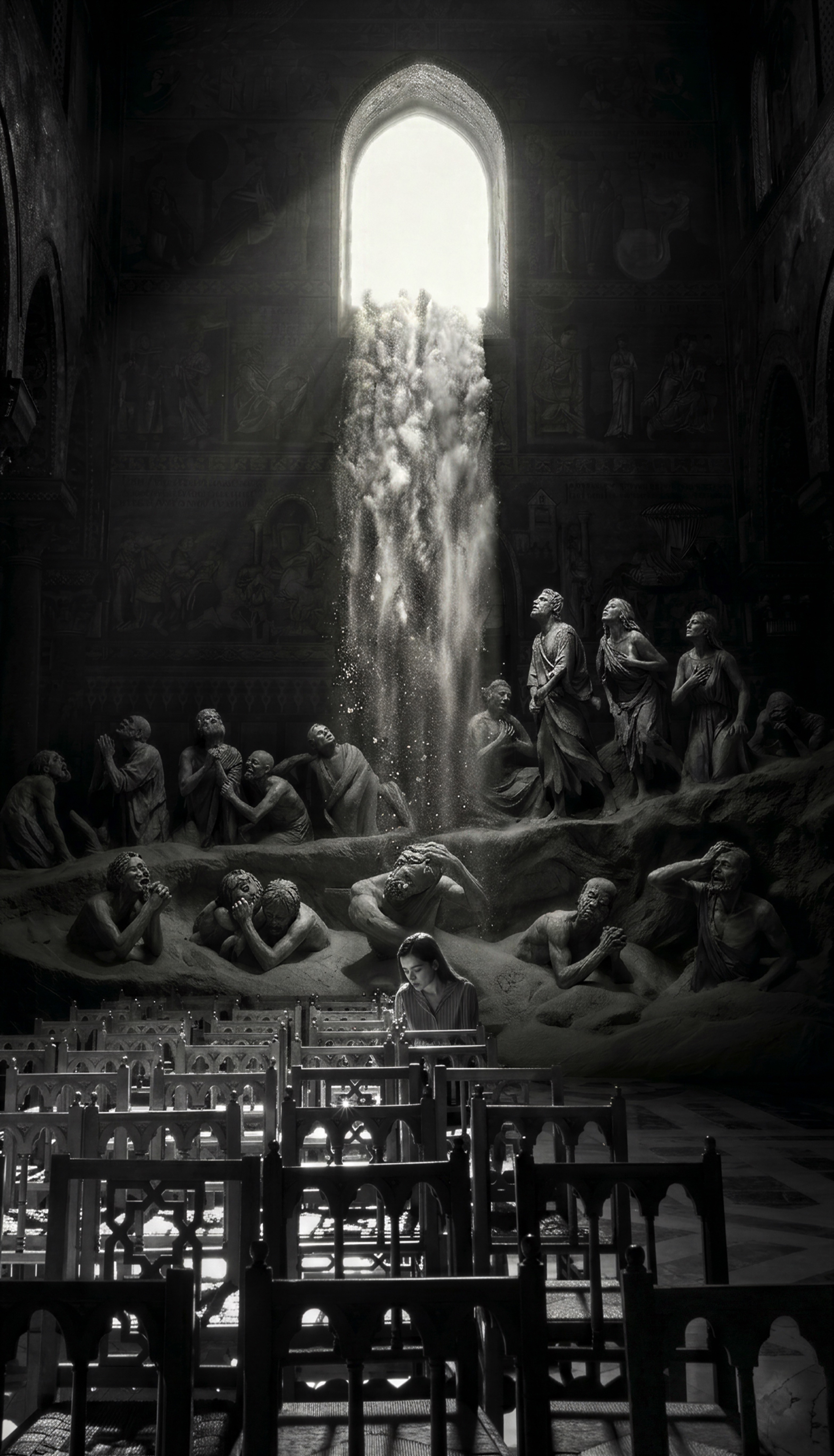In this metaphysical threshold, the Fourth Suite becomes a revelation. From the "Nero Guddo" descends a waterfall of solid light, flooding a humanity made of stone. As if in a Dantean circle seeking redemption, sculptural souls reach upwards.