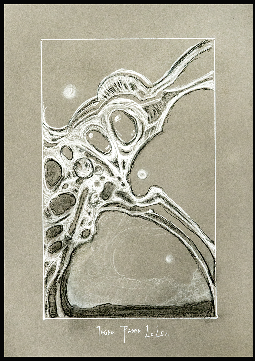 Praca wykonana na papierze 250 gr/m2 format A3 w oprawie aluminiowej czarnej pod szkłem.