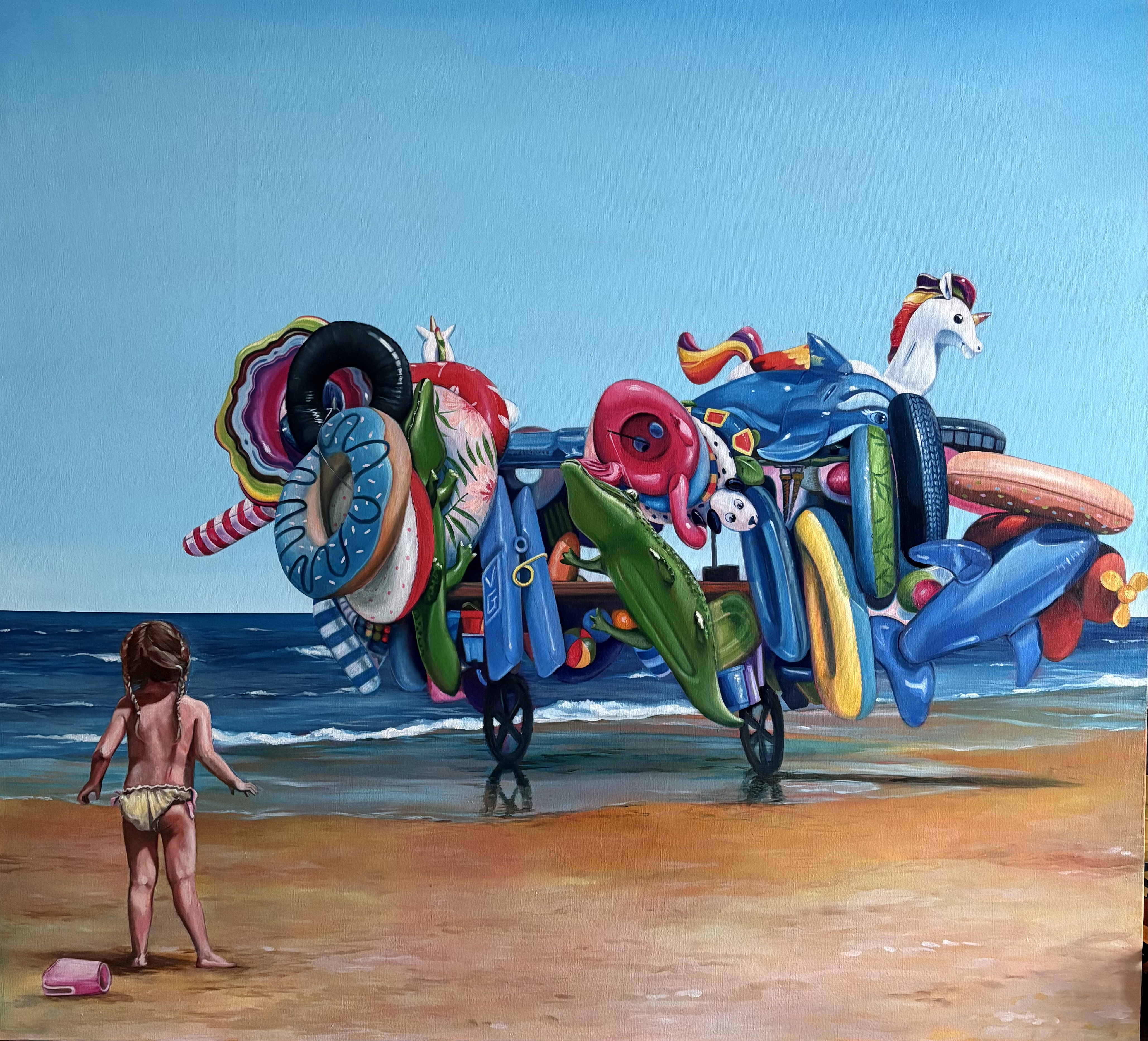 Valentina Galletta “Effimere saturazioni” Olio su tela 100 x 110 La scena presentata è apparentemente leggera, evoca atmosfere estive e piacevoli: una spiaggia, una bambina e diversi giochi, colorati e stimolanti la fantasia di grandi e piccini. Osservando con attenzione l’opera, però ciò che emerge preponderante non è l’aspetto ludico, che invece pare disatteso, piuttosto una più profonda critica alla società contemporanea. Il paesaggio naturale che inizialmente appariva dominante è “messo in ombra” dall’ insieme di oggetti effimeri, futili, artificiali che la bambina guarda, anelandoli più del mare stesso. La natura rasserenatrice è marginale rispetto al consumismo che occupa il centro della scena. I bambini, dunque, crescono immersi in un ambiente dove il desiderio viene costantemente stimolato e soddisfatto, facendo perdere la giusta dimensione alle cose in nome di un processo volto alla saturazione. In questo senso il cambiamento a cui allude l’opera non è solo progresso, ma anche perdita: perdita del silenzio, dello spazio e dell’essenzialità nell’immensità a cui quel paesaggio naturale rimanda. Ci si pone dunque, una domanda: Che cosa stiamo davvero insegnando, trasmettendo alle nuove generazioni? Quale l’eredità ad essi lasciata?