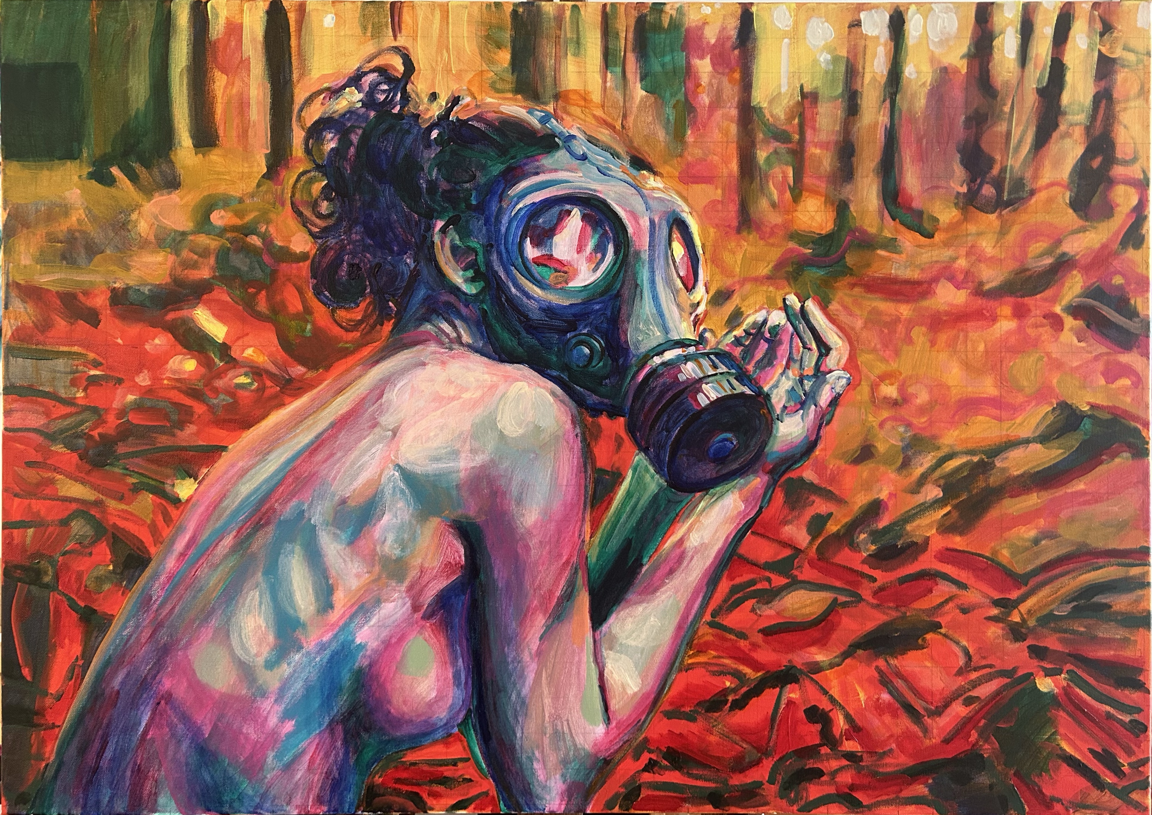 A crouching figure wearing a gas mask appears both vulnerable and transformed, inhabiting a landscape marked by ruin and survival.