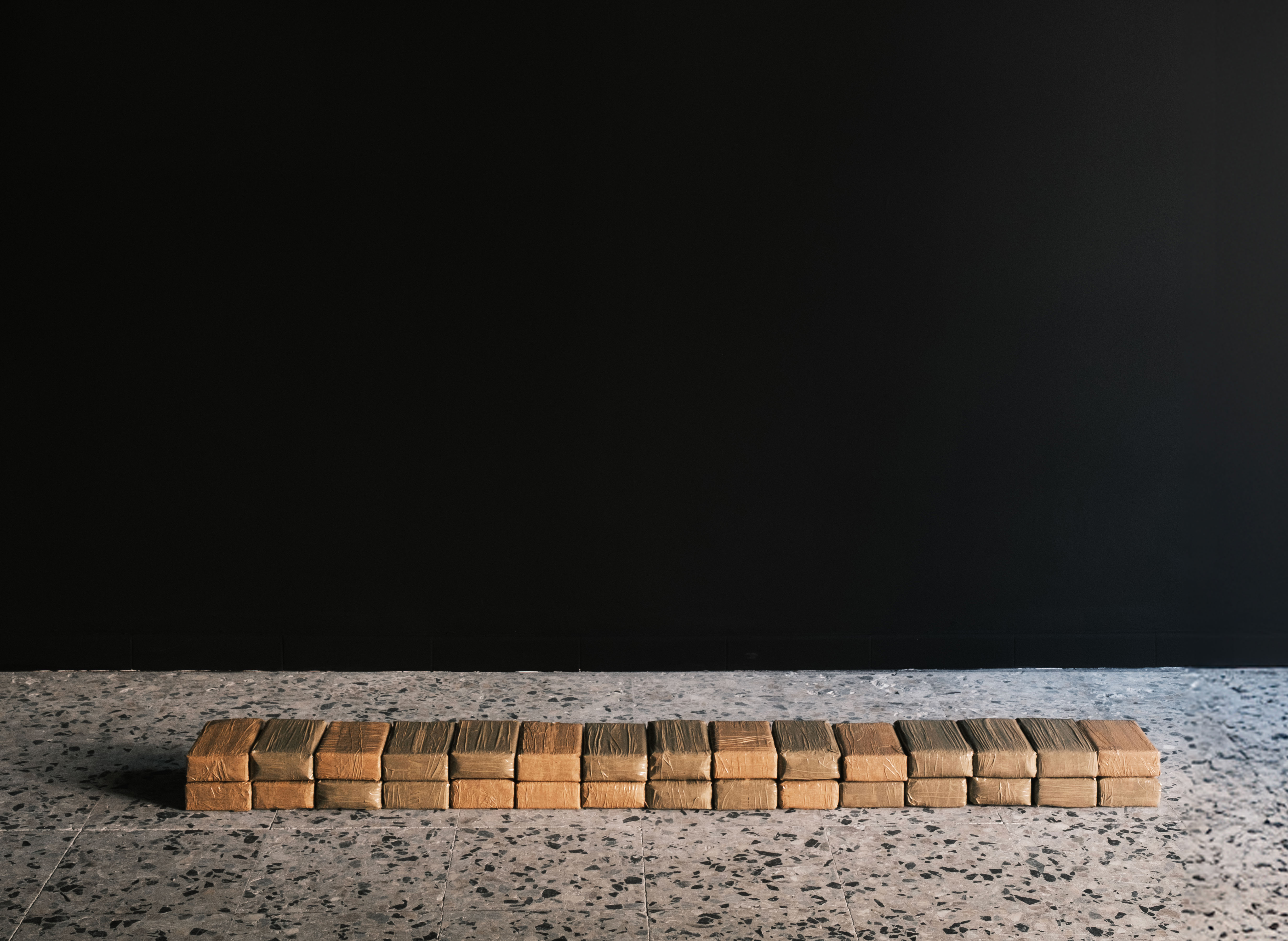“Gioia” infrange tabù e barriere morali; ciò che guardiamo è un corretto esempio dell’inatteso che non darà soluzione. L’opera di Giulio Manglaviti approda a una conclusione controintuitiva e al contempo coerente. Il bisogno compulsivo di allineare e disporre i pacchetti secondo criteri rigorosi, ha come risultato quello di alleviare l’ansia e il disagio causati dall’ipotesi del contenuto. L’astratto e l’indecifrabile   si fondano sul fraintendimento del linguaggio che qui si fa carico dell’opera. Si muove in ambito speculare, maneggiando materia oscura, filosofica, intangibile e definitiva.