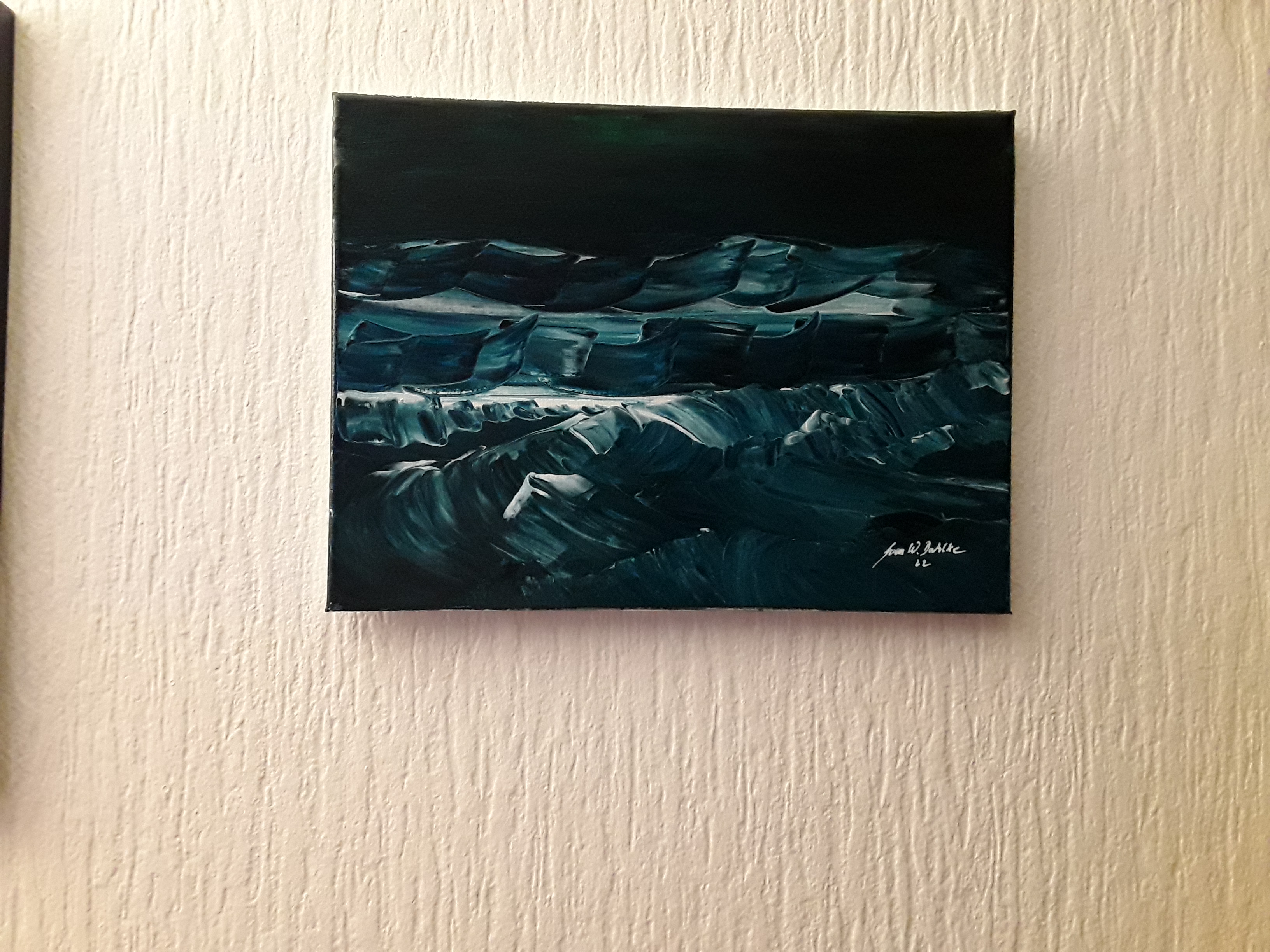 Das Werk ist in Acryl auf Canvas gefertigt. Ich habe mich hier vom Sound der Wellen welche wie ein melacholisches beruhigendes Lied auf einen Wirken, inspirieren lassen. Die Bewegung der Wellen wie der Taktstock des Dirigenten, die Weite des Nachthimmels, die Brandung und das ausrollen der Wellen sind wie ein Lied.